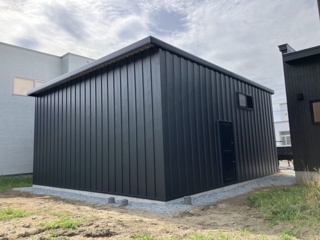 会社倉庫として施工!!!23畳の広々空間°˖✧ 鉄骨塗装色:グレー 外壁色:サンドブラック(縦) アルミ破風:ブラック 特注サッシ:ブラック 棚・電気工事 -