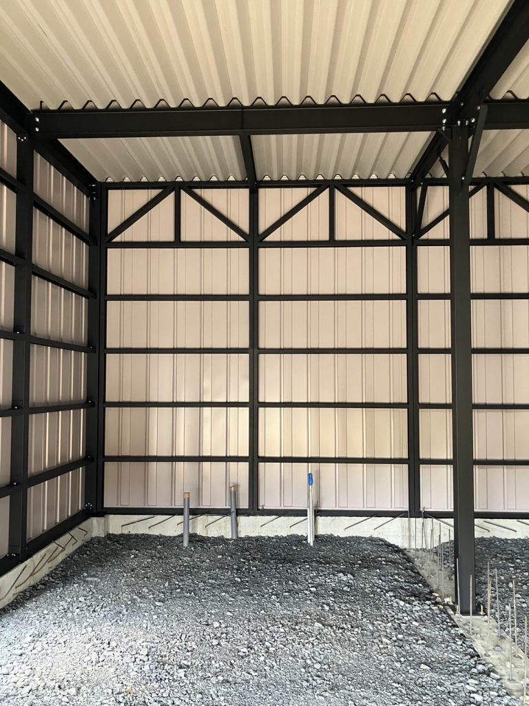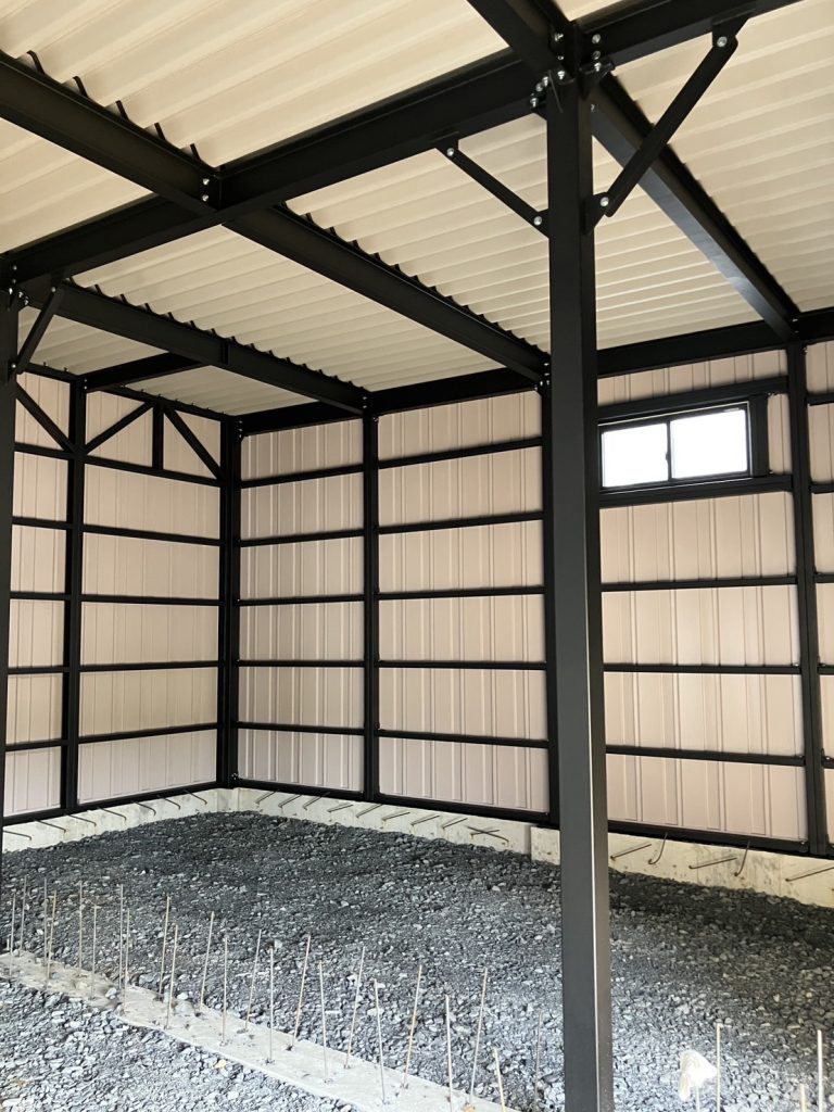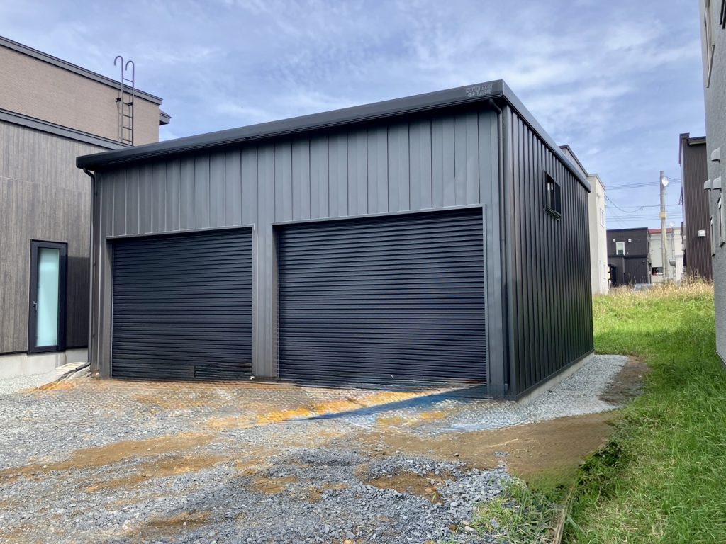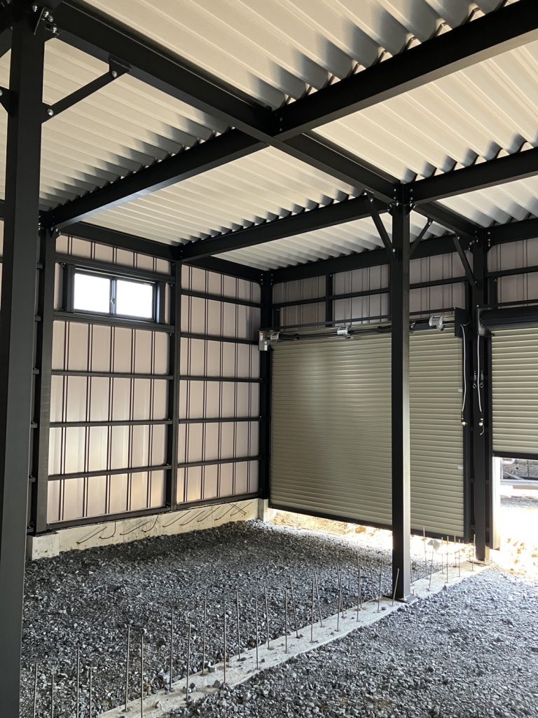 2台用スペースと後ろに約8畳のスペースを確保!!!バイクの出し入れにもストレスなしの空間施工♪ 来春土間工事あり 鉄骨塗装色:サンドブラック 外壁色:サンドブラック(横) アルミ破風:ブラック シャッター:ブラック ドレンパイプ:ブラック -