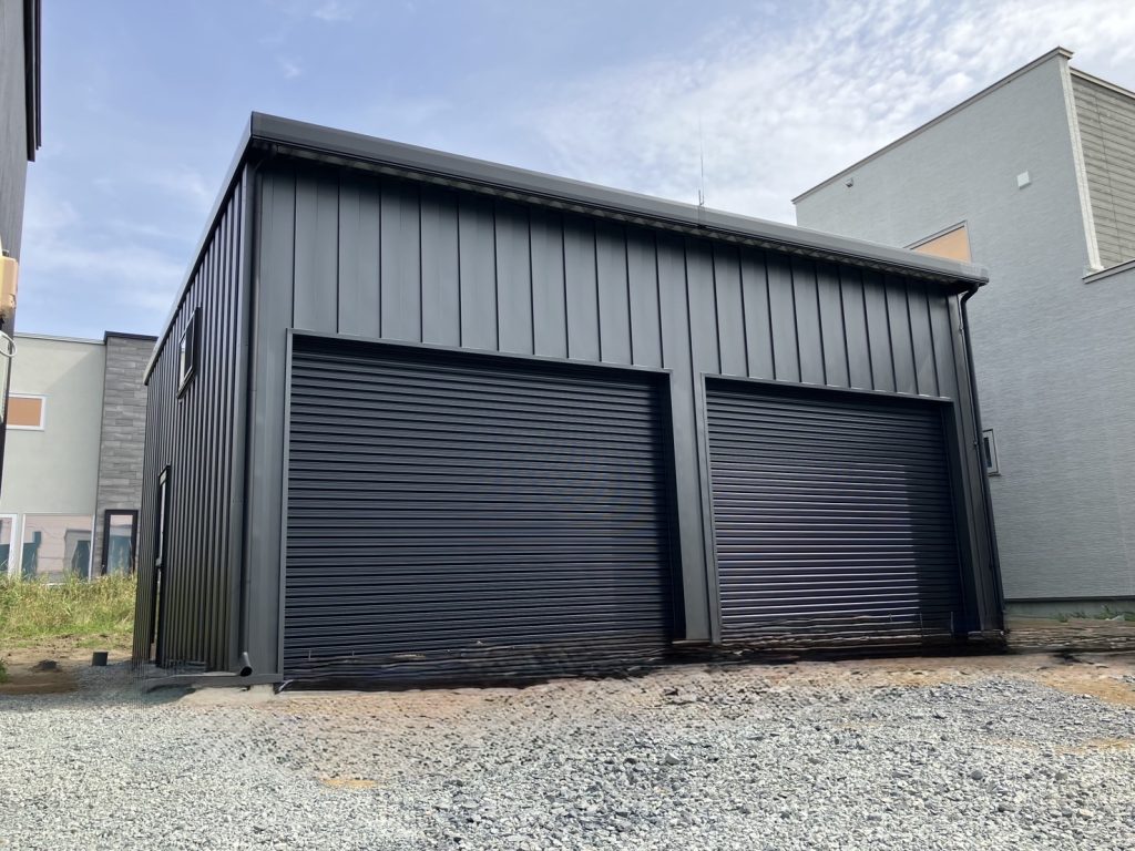 特注連棟ガレージ!!!特注電動シャッター付 鉄骨塗装色:ブラック 外壁色:カーボンブラック(縦) アルミ破風:アーバングレー シャッター:フラットピット ステン色 アルミドア:アーバングレー -