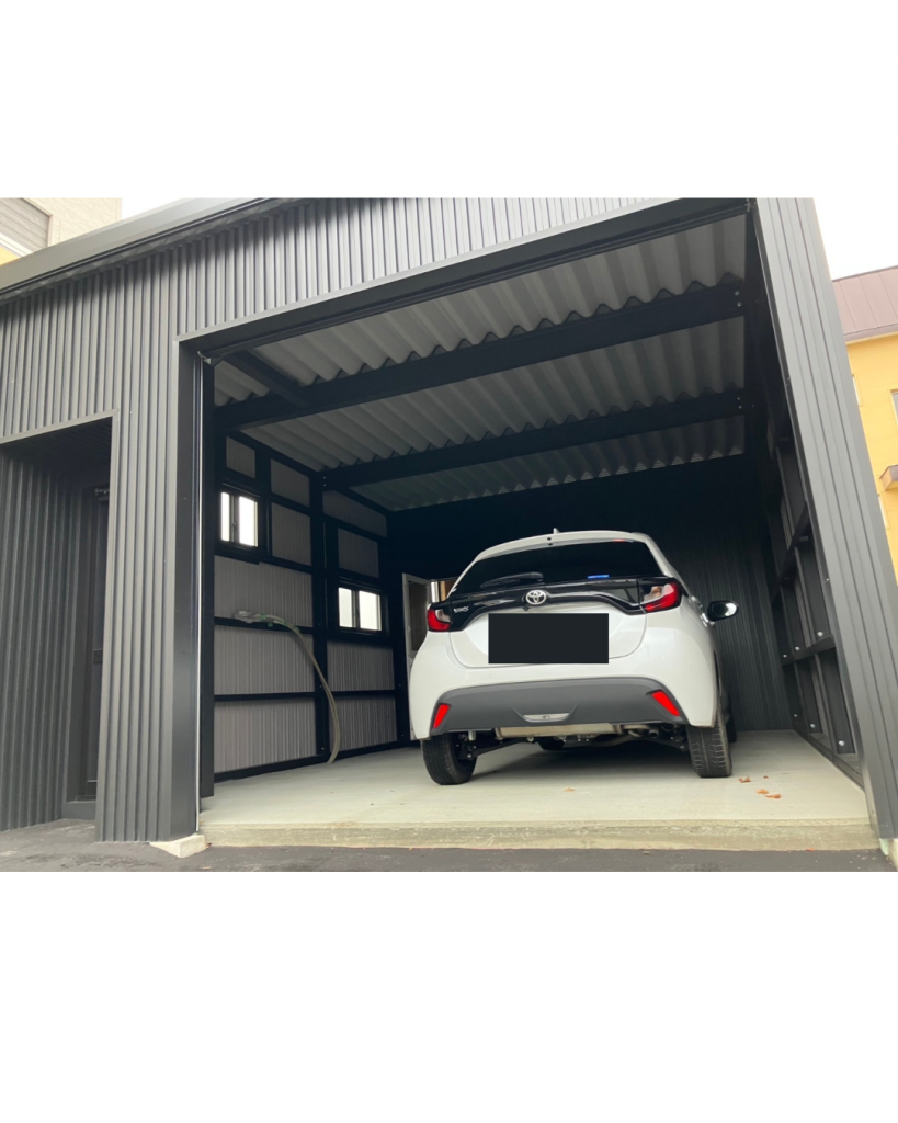 狭い空間に家とマッチしたガレージを設置!!! 鉄骨塗装色:グレー 外壁色:チャコールグレー(縦) アルミ破風:ブラック シャッター:シルバーグレー ドレンパイプ:ブラック