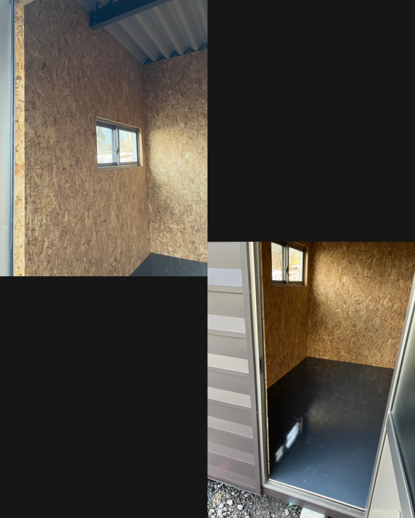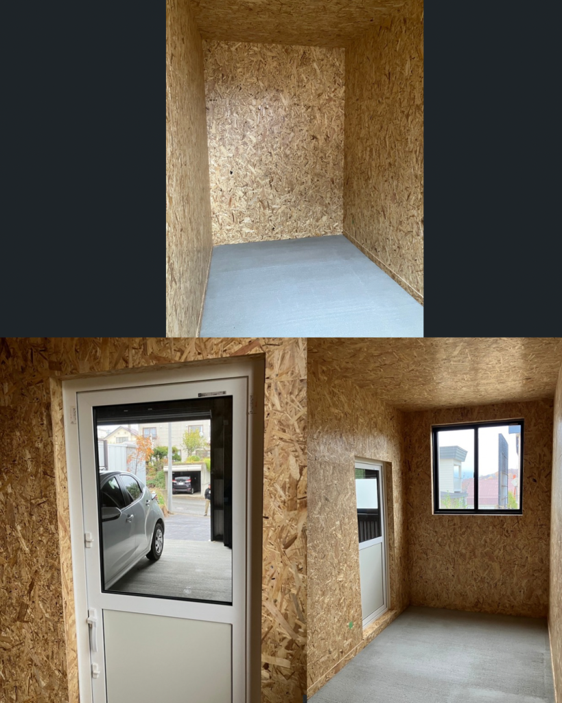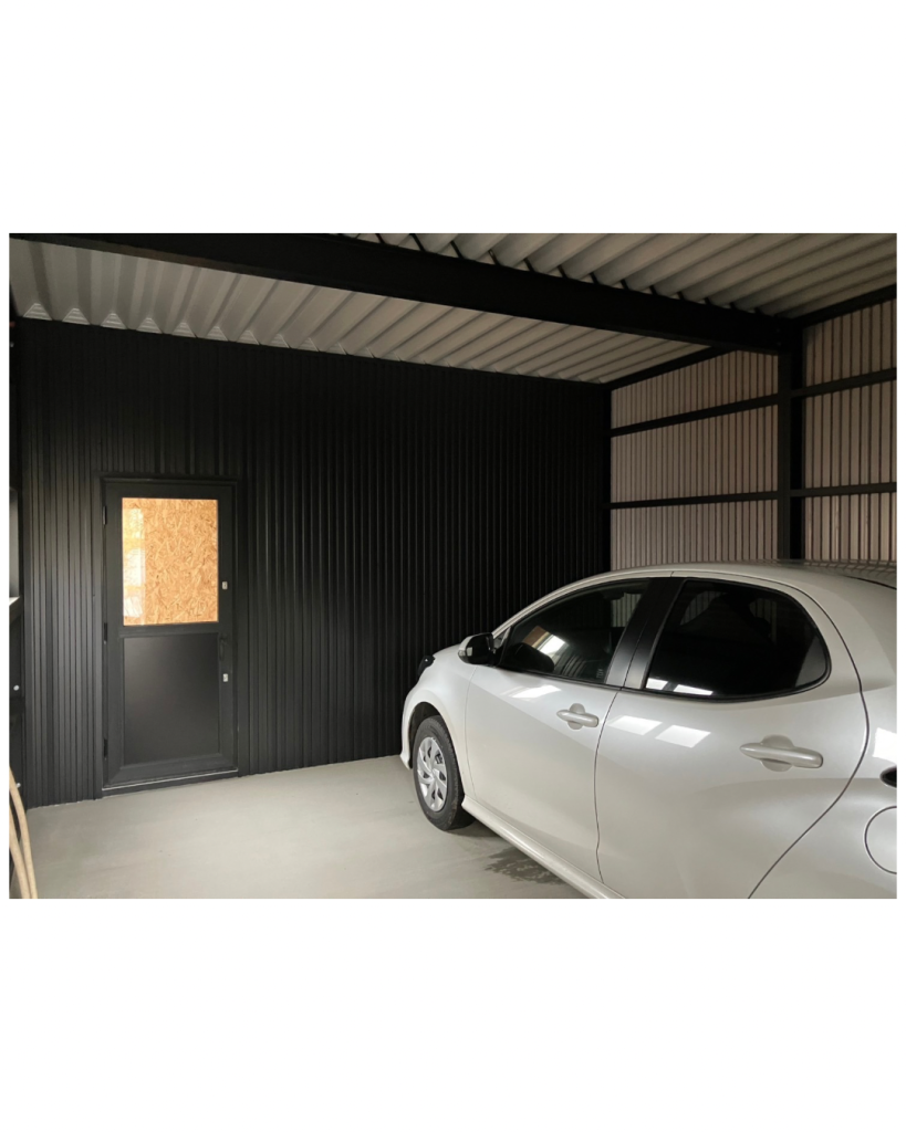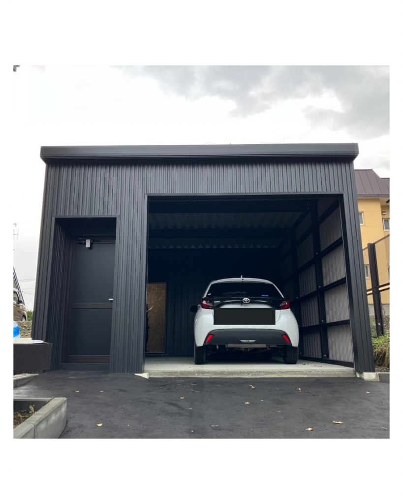 生活スペースとバイク空間は間仕切壁(OSB)使用!!! 鉄骨塗装色:グレー 外壁色:エバーグリーン(横) アルミ破風:ブラック シャッター:特注色 ドレンパイプ:ブラック 土間工事:オカモトさん -