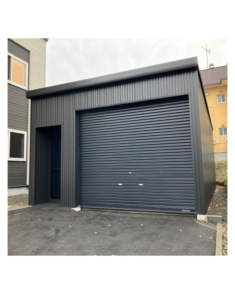 特注連棟ガレージ!!!特注電動シャッター付 鉄骨塗装色:ブラック 外壁色:カーボンブラック(縦) アルミ破風:アーバングレー シャッター:フラットピット ステン色 アルミドア:アーバングレー -