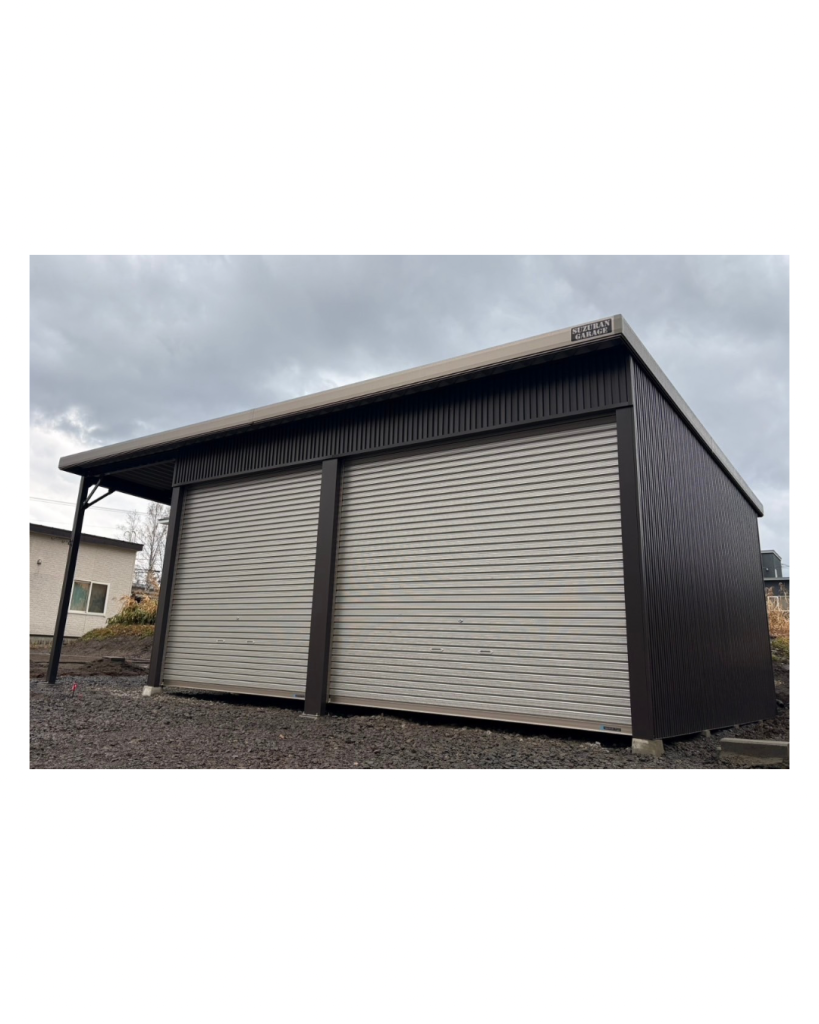 2台用ガレージ+屋根のみフリースペース+床・内壁OSB納めスペース4畳 鉄骨塗装色:グレー 外壁色:ソイルブラウン(K180) アルミ破風:アーバングレー シャッター:ミストシルバー(エスプリ) ドレンパイプ:ブラック アルミドア:アーバングレー 窓枠:アーバングレー -