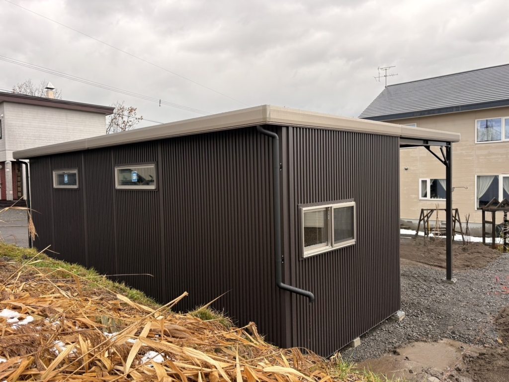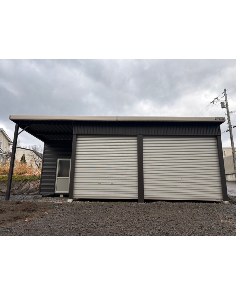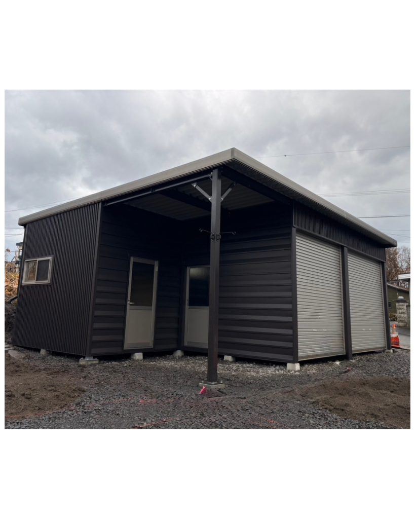 2台用スペースと後ろに約8畳のスペースを確保!!!バイクの出し入れにもストレスなしの空間施工♪ 来春土間工事あり 鉄骨塗装色:サンドブラック 外壁色:サンドブラック(横) アルミ破風:ブラック シャッター:ブラック ドレンパイプ:ブラック -