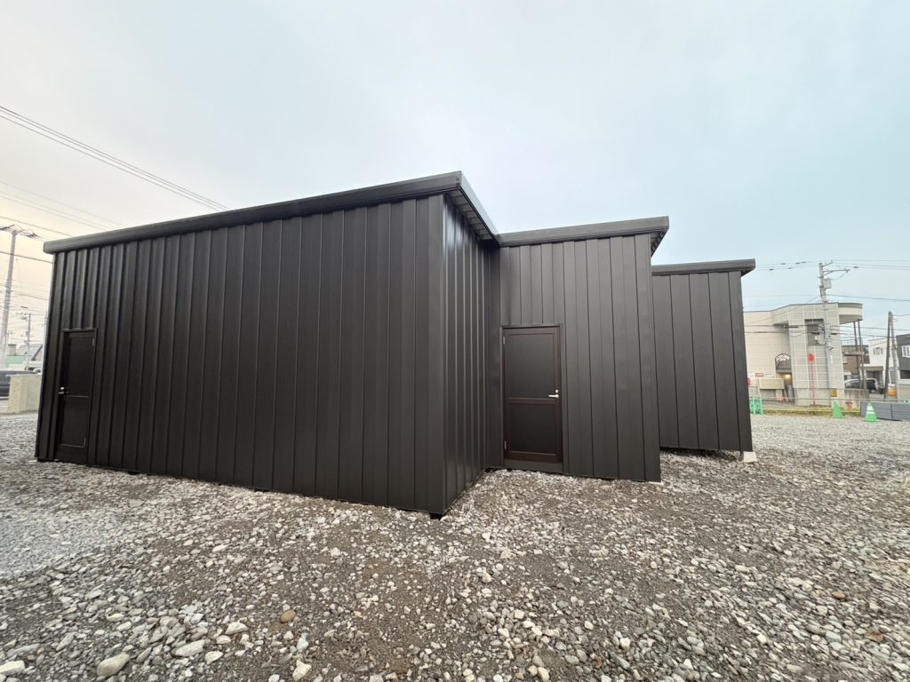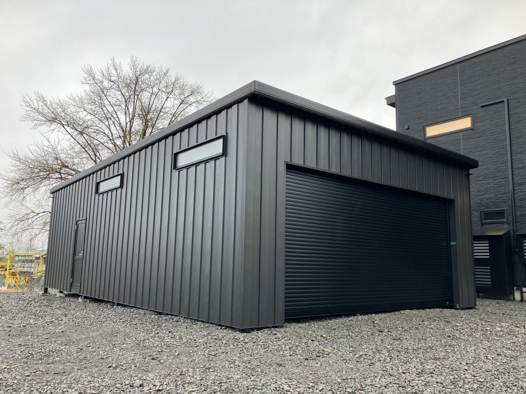 特注連棟ガレージ!!!特注電動シャッター付 鉄骨塗装色:ブラック 外壁色:カーボンブラック(縦) アルミ破風:アーバングレー シャッター:フラットピット ステン色 アルミドア:アーバングレー